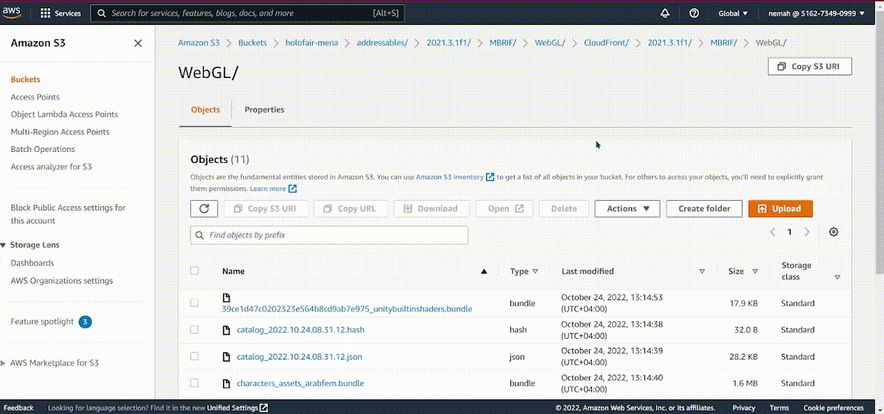 6\) Then in case if you are updating addressables, go to *AWS Console -> S3 -> Your public bucket -> Addressables -> 2021.3.1f1 ->Your product name that you specified in Unity3D Player Settings -> WebGL* and this is where you need uploaded updated files from you local folder where addressables have been compiled, i.e. from *PROJECT-ROOT-DIRECTORY/ServerData/CloudFront/addressables/2021.3.1f1/Your product name that you specified in Unity3D Player Settings/WebGL.*&#x20;